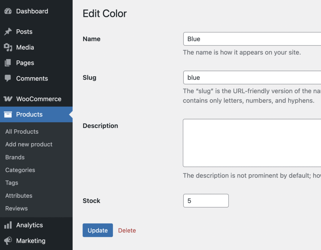 Instead of managing stock individually, we’ll store stock directly inside the attribute term itself.
